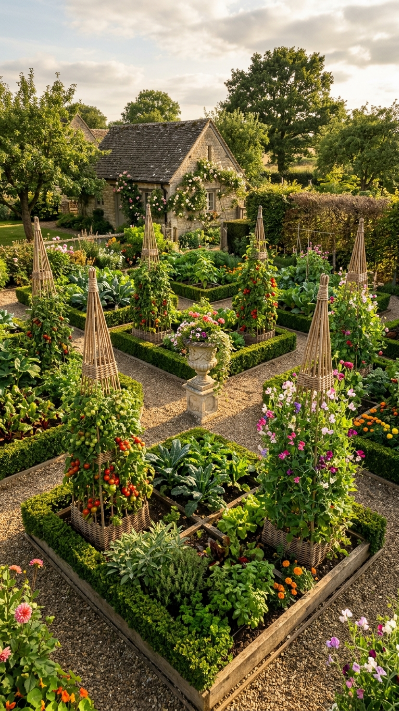 What makes it work: Wicker obelisks provide instant vertical structure within raised beds while keeping the whole scheme firmly in the rustic, artisanal register. The formal geometry of the bed layout contrasts brilliantly with the unruly abundance of what grows within — that tension is the defining quality of a great potager.