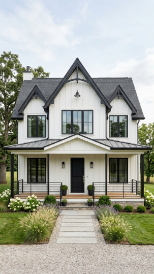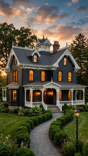 A dramatic all-black exterior with white trim — bold, gothic-romantic, and unforgettable.