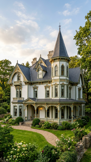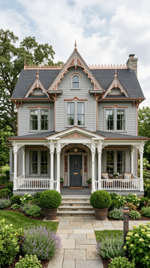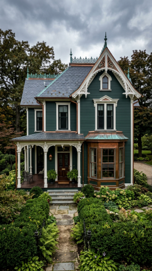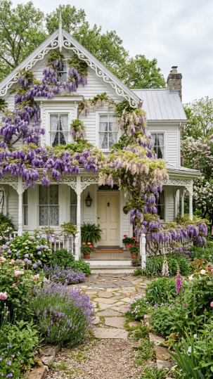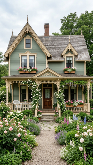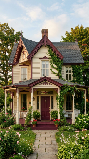Romantic climbing wisteria or ivy softening the Victorian facade — wildly beautiful and timeless.