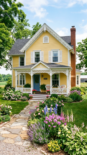 Sunny yellow siding with intricate white gingerbread trim — joyful, bright, and full of personality.