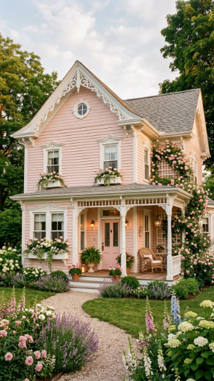 The dreamiest blush pink siding with white trim — soft, feminine, and impossibly Pinterest-perfect.