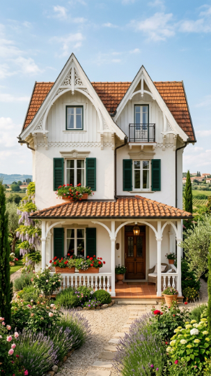 Crisp white Victorian siding beneath warm terracotta clay roof tiles — European farmhouse magic.