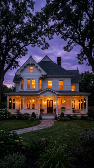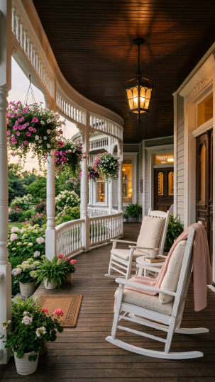 A sweeping Victorian wrap-around porch with hanging baskets, rockers, and evening lantern glow.