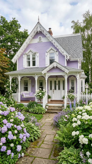 Soft lavender siding with white ornate trim — whimsical, romantic, and utterly unforgettable.
