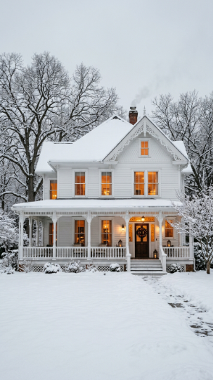 A pristine white Victorian farmhouse blanketed in fresh snow — magical, serene, and breathtaking.