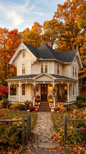 Warm fall foliage surrounding a classic Victorian farmhouse — cozy, colorful, and absolutely stunning.