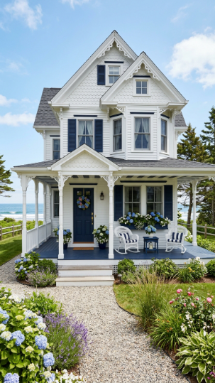 White Victorian siding with navy accents, a breezy porch, and ocean-inspired details — fresh and breezy.