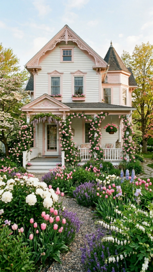 A Victorian farmhouse bursting with spring blooms — the most romantic exterior imaginable.