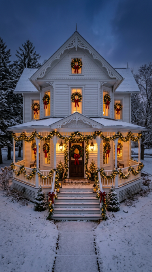A snow-dusted Victorian farmhouse dressed in holiday garland and glowing lanterns — pure magic.