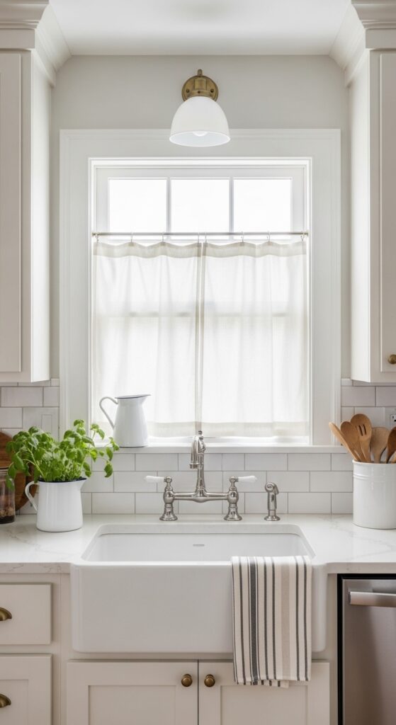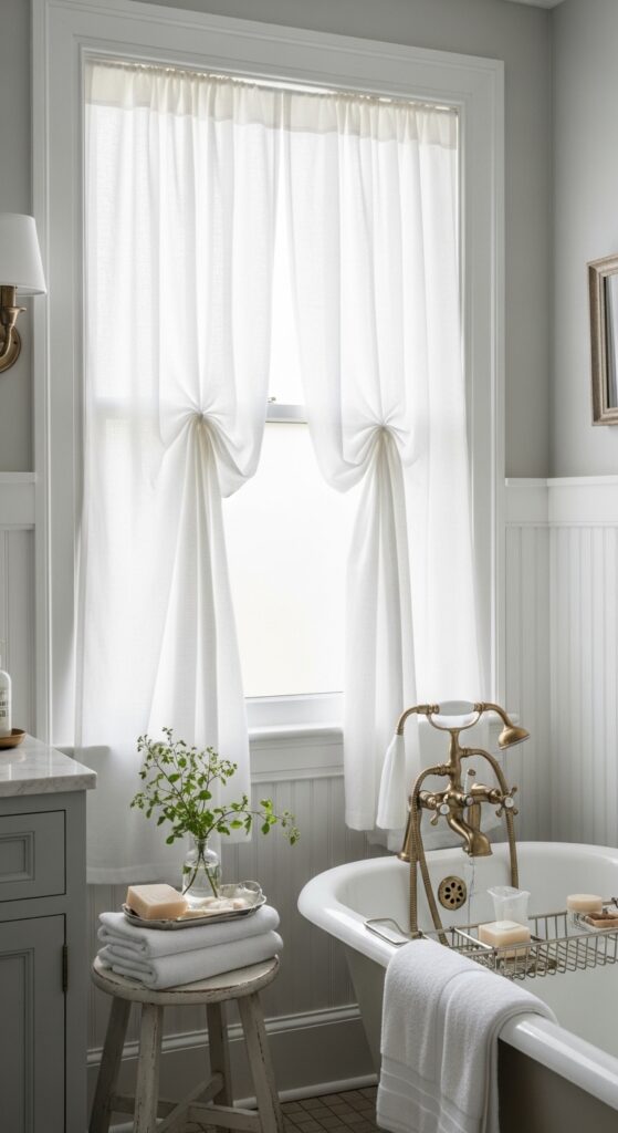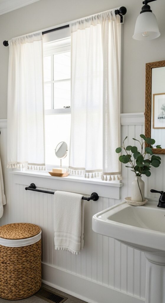 Why it works: White curtains in a bathroom preserve brightness while still softening tile and painted paneling. That matters in farmhouse baths, where the goal is warmth and ease, not heavy window dressing.