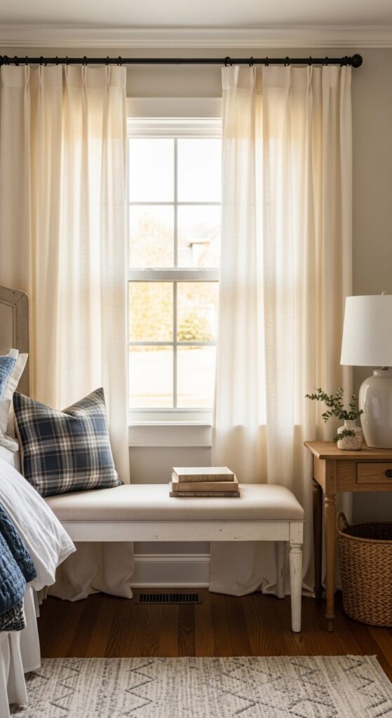 💡 Quick Win: The simplest upgrade for a plain window seat is a better curtain length, not more pillows.