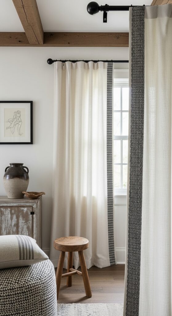 Why it works: Trim introduces pattern in a narrow, controlled band, which is often more effective than using a fully patterned curtain. It gives the eye a crisp edge and frames the window while preserving the calm drape of a neutral panel.