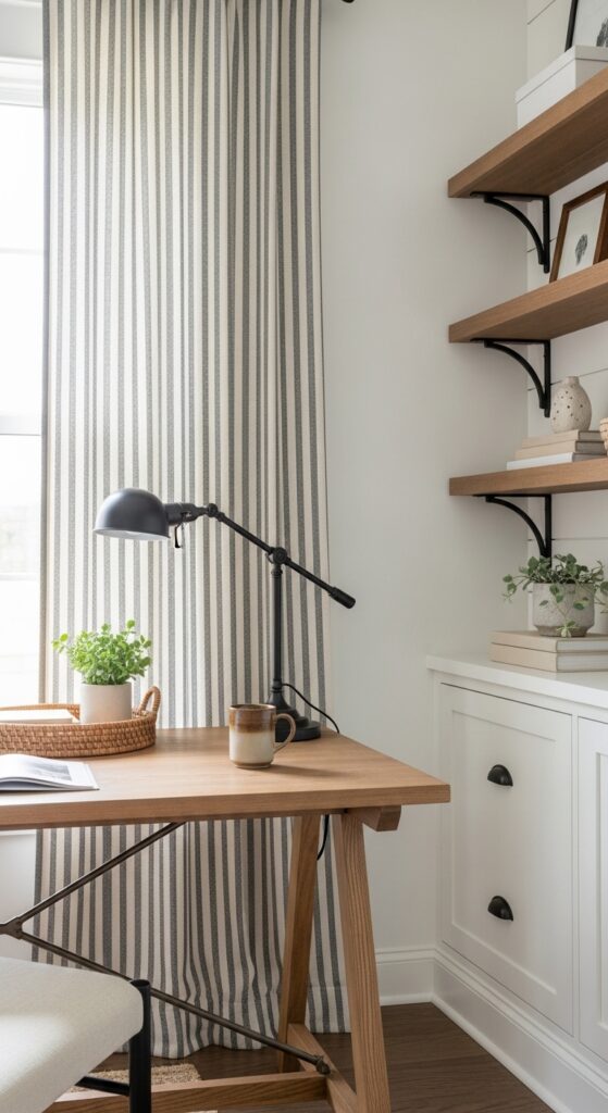 13. Farmhouse Curtains Ideas With Charcoal Ticking Stripe in the Home Office