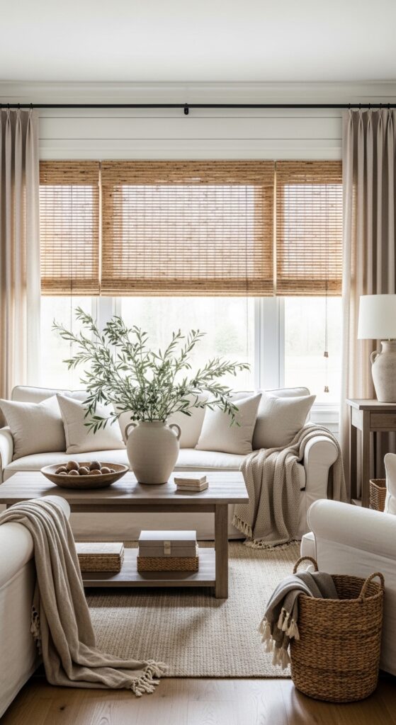 14. Bamboo Shades Layered Under Soft Drapes in the Family Room