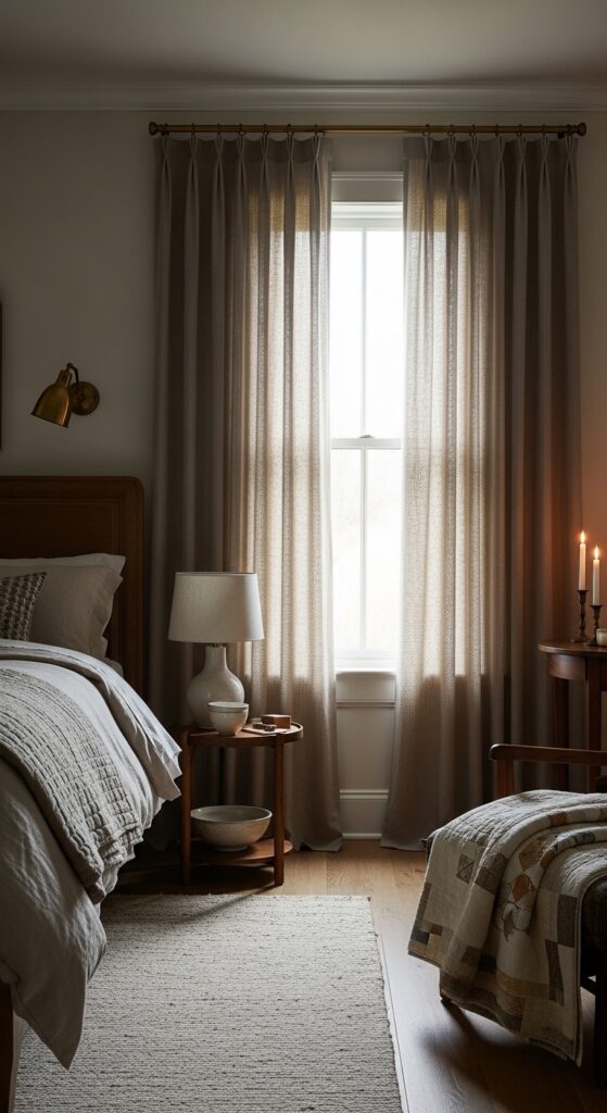 Why it works: Flax tones bring warmth into a bedroom without the heaviness of darker fabric. Because the weave has slight variation, the curtains add texture layering at the perimeter of the room, which helps the bed feel softer and the walls less flat.