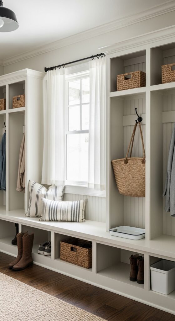16. Curtains That Stop Cleanly Above a Mudroom Bench