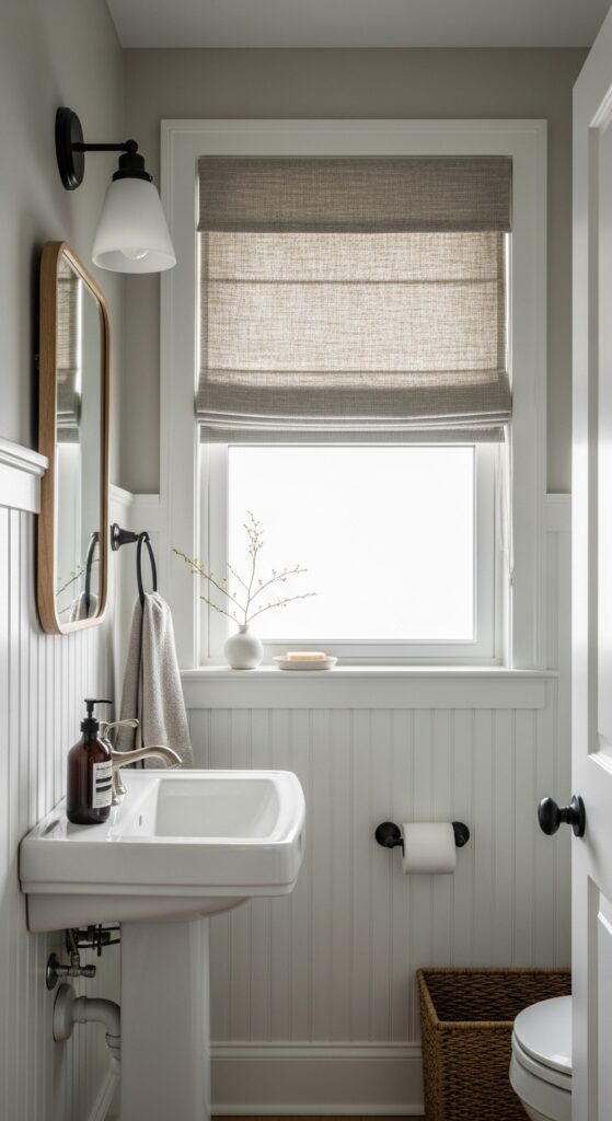 Why it works: Small powder rooms benefit from reduced contrast. A Roman shade close to the wall color lets the window recede slightly, which cuts down visual interruption and keeps the space feeling cleaner than full side panels often do.