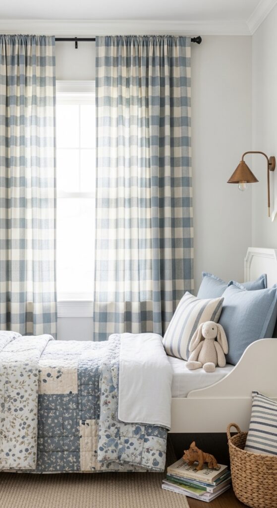 Why it works: A soft check pattern adds personality without tipping into theme decor, which matters in children’s rooms that need to age well. Dusty blue stays calm, and the repeated square rhythm adds energy while still feeling organized.