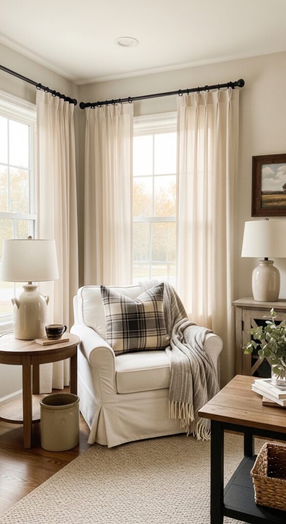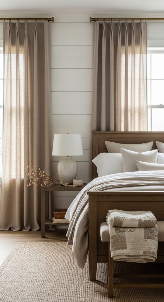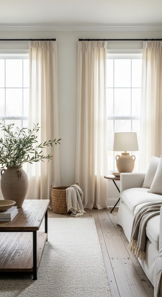 Why it works: Warm white linen adds movement without visual noise, which is exactly what a farmhouse living room needs when wood, upholstery, and rugs are already doing a lot of textural work. The soft folds lighten the vertical plane of the wall and keep the windows from reading stark.
