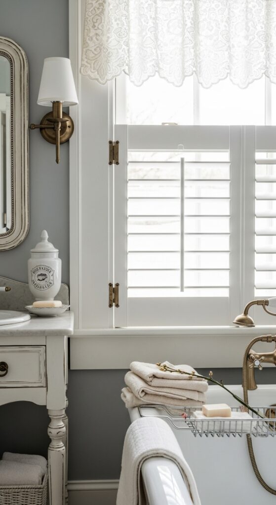 How to get it: Use lace as the outer softness and let shutters handle most of the privacy control. This works best in older-style baths where vintage detail already exists in the vanity, mirror, or tub.