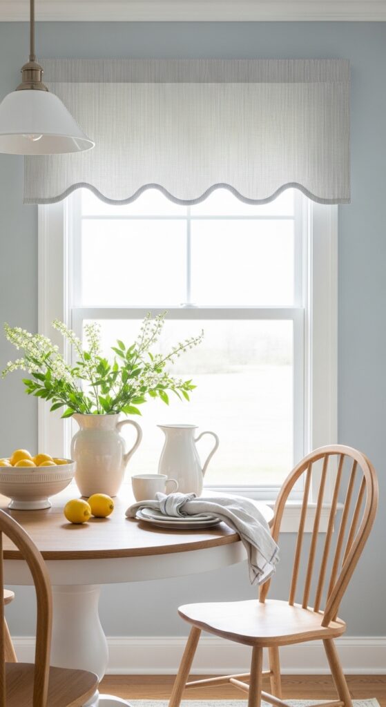 Why it works: A valance is useful where you want softness but do not have the wall space for full panels. The scalloped edge adds character, and the short drop keeps the breakfast area bright and uncluttered.