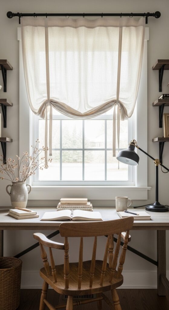 Why it works: A desk under a window needs a treatment that does not interfere with the tabletop or chair movement. Tie-up curtains keep the window dressed while preserving negative space around the work surface, which helps the room feel less cramped.