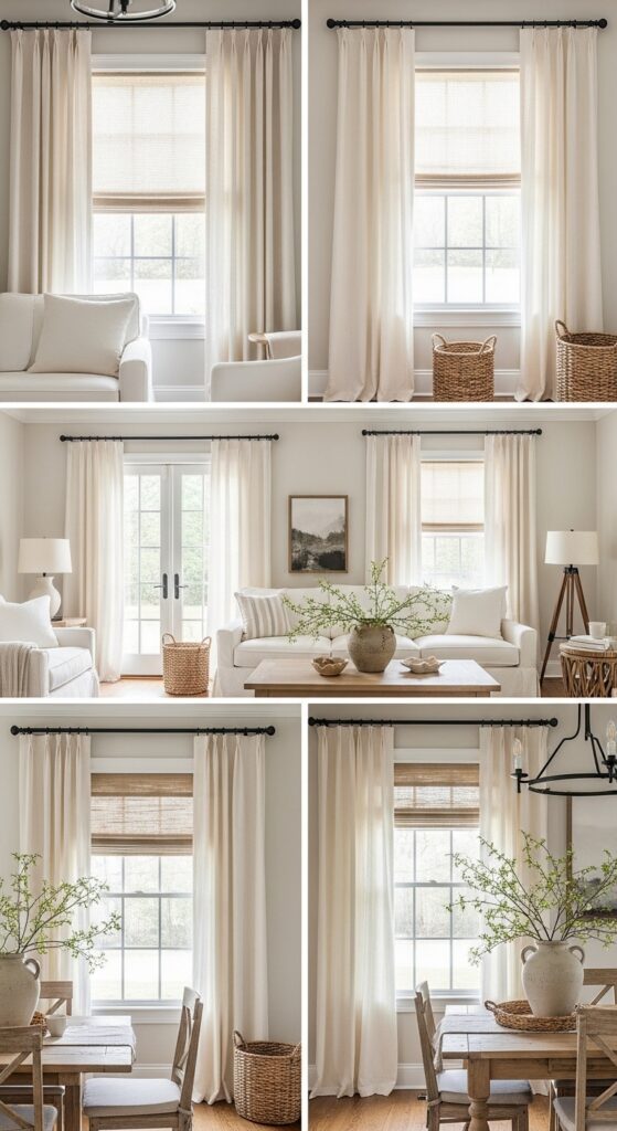 Why it works: Repetition is what makes farmhouse curtain choices feel intentional rather than random room by room. When the color family, hardware finish, or fabric texture echoes throughout the house, the eye reads continuity even if one room uses panels and another uses café curtains or shades.