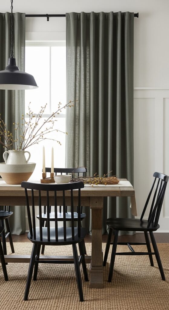 8. Farmhouse Curtains Ideas in Muted Sage for the Dining Room