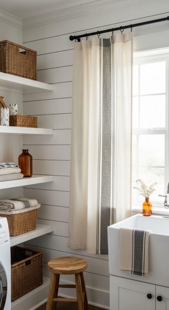 Why it works: Grain sack stripes bring one controlled line of contrast into a work-heavy room. In a laundry area, that structure is useful because it helps the fabric feel crisp against shelves, appliances, and all the small objects that can quickly create visual clutter.