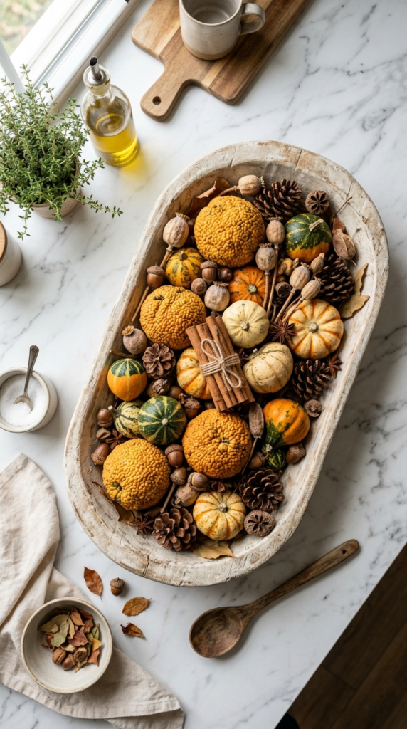 Swapping out your everyday lemon or fruit bowl with a beautiful wooden dough bowl overflowing with Osage oranges, small gourds, acorns, and dried seed pods is the fastest five-minute fall kitchen transformation you’ll ever make.