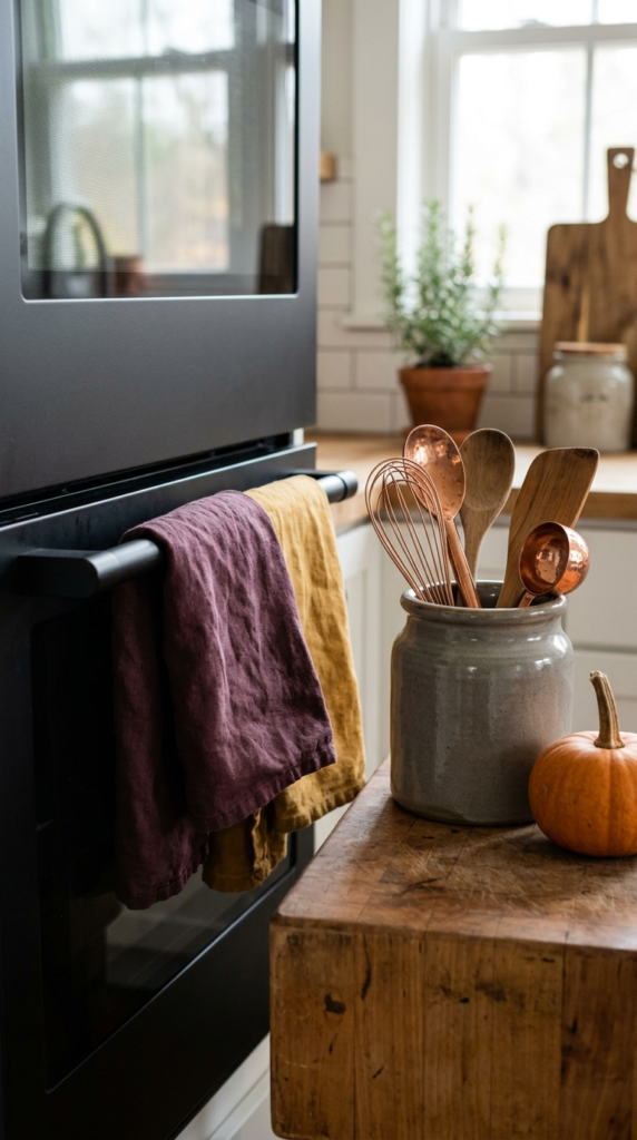 Swapping your kitchen towels to deep plum, mustard yellow, and burnt orange linen dish towels draped over an oven handle, paired with a crock of copper and wooden utensils, is the easiest fall refresh that costs almost nothing.