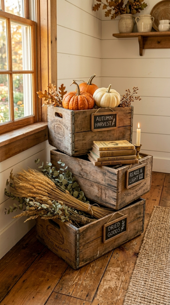 A tall stack of weathered wooden crates placed in a kitchen corner, each crate cradling a different autumn arrangement — one with pumpkins, one with books and candles, one with dried botanicals — creates a rustic display cabinet with zero cost.