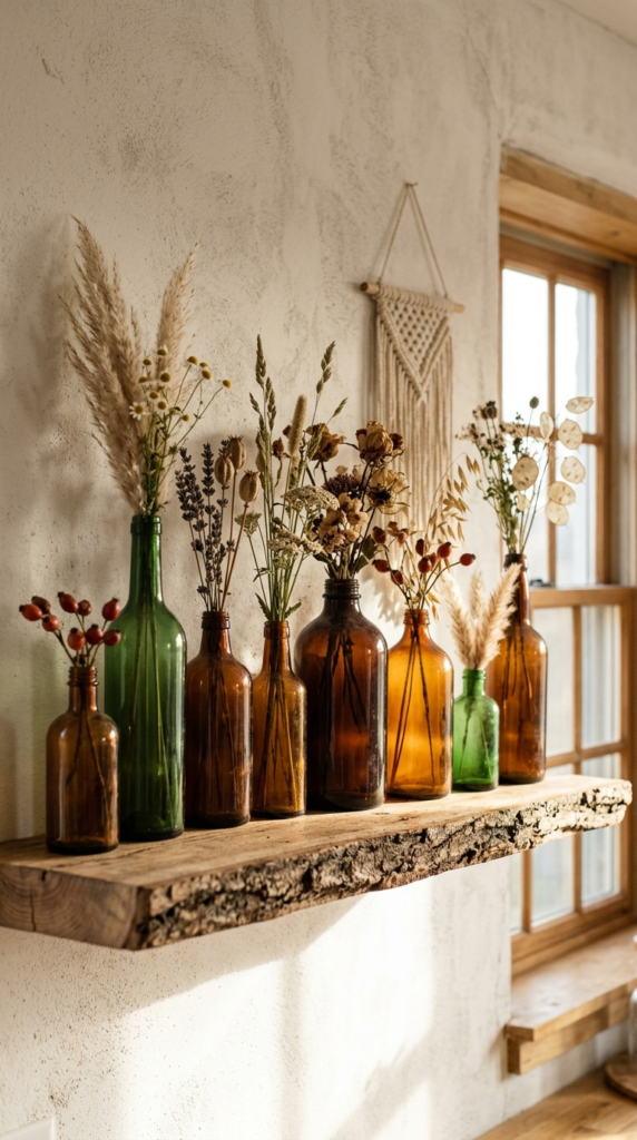 Styling Tips: Vary the bottle heights and neck widths dramatically for visual interest. The amber glass bottles catch and refract warm light in the most gorgeous way — position near a window if possible. Don’t overfill bottles; a few stems casually placed look far better than a packed bunch.