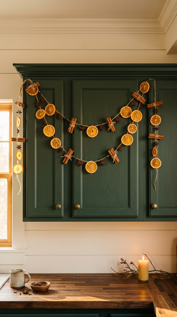 A simple hand-made garland of bundled cinnamon sticks, dried orange slices, star anise, and whole cloves threaded on jute twine draped over upper kitchen cabinet doors is both aromatic decor and free entertainment to make.