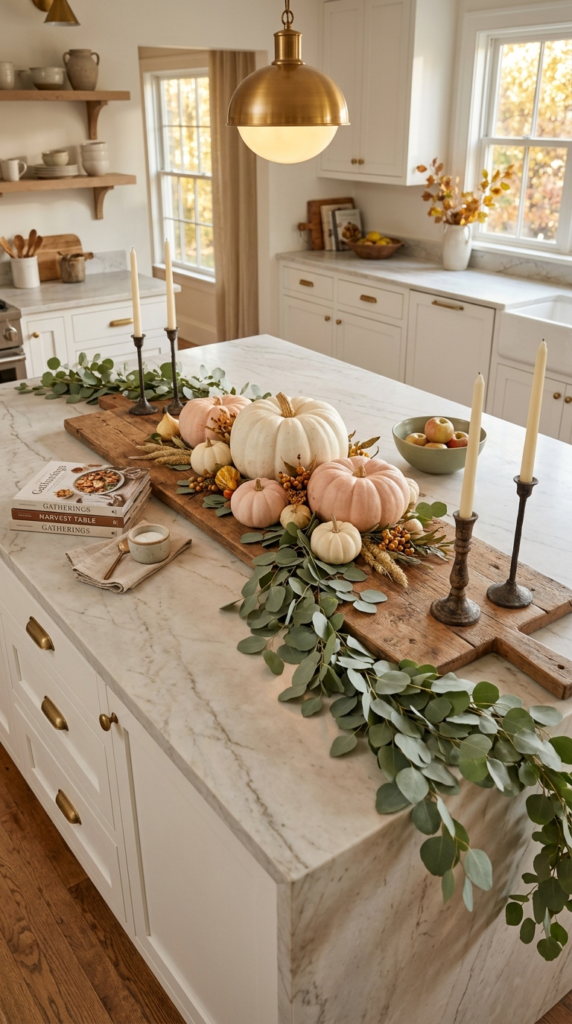 A large farmhouse kitchen island dressed for fall with a long wooden cutting board runner, clusters of white and blush pumpkins, tall taper candles in iron holders, and a loose eucalyptus garland is a magazine-cover moment waiting to happen.