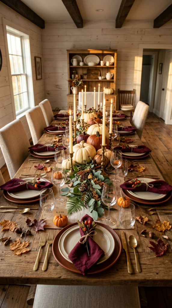 Styling Tips: This is where you layer everything — table runner, placemats, cloth napkins knotted with twine, a full centerpiece of pumpkins and candles down the center, individual place settings with a small pumpkin or acorn at each plate, and loose dried leaves scattered across the table. Leave intentional gaps — over-styling looks cluttered; strategic abundance looks luxurious.
