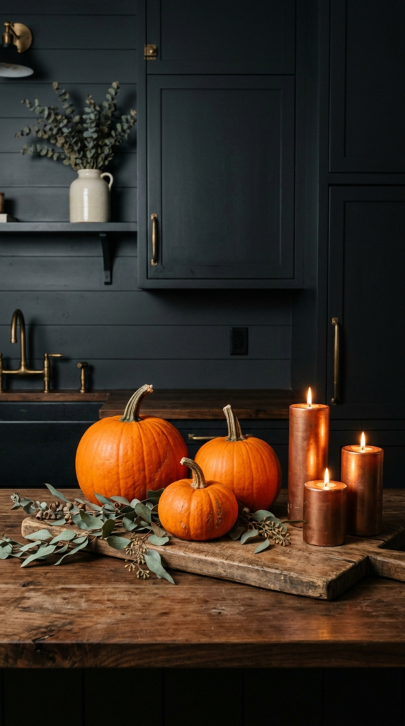 Styling Tips: In dark kitchens, use more candles than you think you need — the warm light against the dark surfaces is the entire magic of this look. Choose the most saturated, vivid orange pumpkins you can find as the contrast against dark backgrounds is spectacular. Copper and aged brass hardware are the perfect metallic companions.