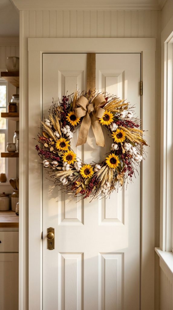 A large, lush wreath of dried sunflowers, wheat stalks, cotton stems, and deep burgundy berries hung on the pantry door or kitchen entrance instantly elevates the entire room’s fall atmosphere.