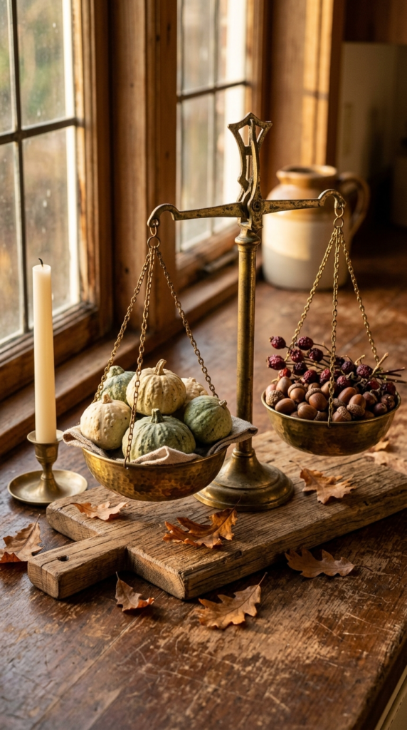A vintage brass or iron kitchen scale — the kind with two flat pans — becomes instant fall decor when one side is filled with small Hubbard squash and the other with polished acorns and dried rosehips.
