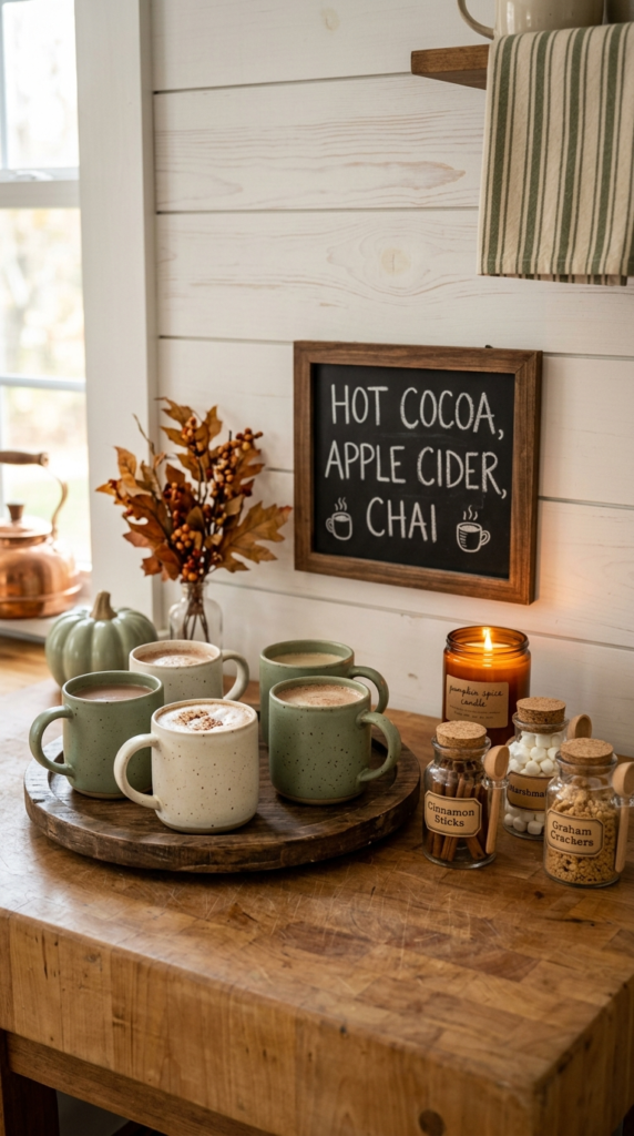 Styling Tips: Group your mugs on a small wooden tray or lazy Susan. Use a mini chalkboard to write the “menu” — hot cocoa, apple cider, chai latte. Store toppings like cinnamon sticks, marshmallows, and crushed graham crackers in small clear apothecary jars with chalkboard labels. The ritual of choosing your drink becomes part of the fall experience.