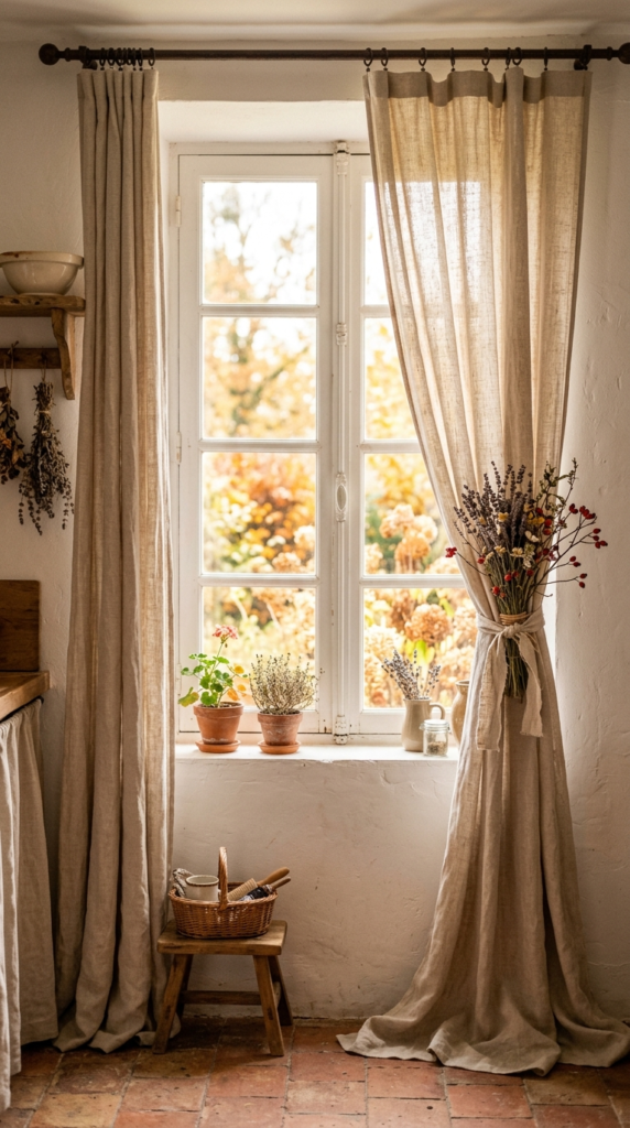 Swapping standard kitchen curtains for relaxed, unlined linen curtains in a warm oat or cream color and tying them back with a bundle of dried lavender and rosehip stems transforms any kitchen window into a French farmhouse fall scene.