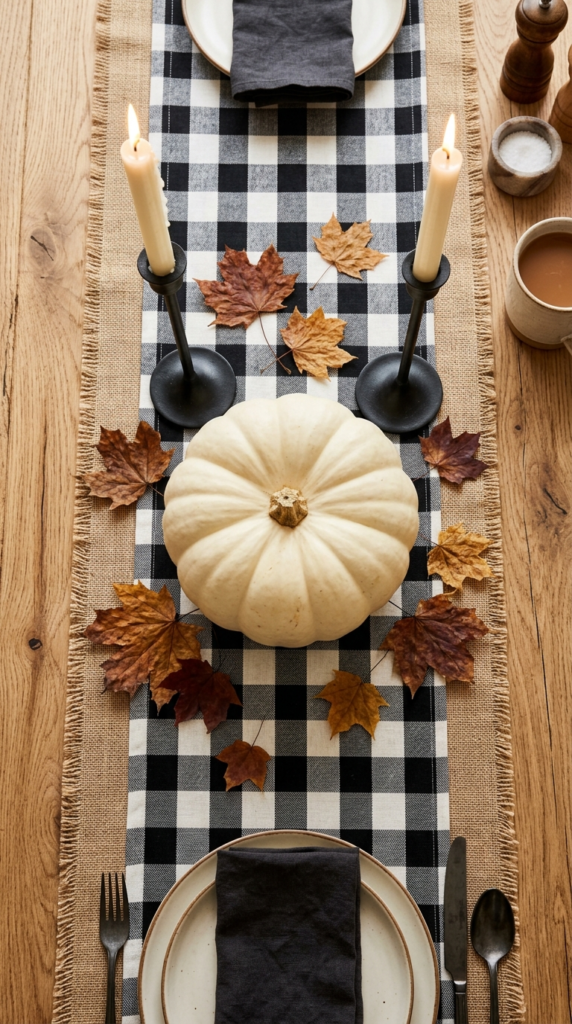Styling Tips: Layer the burlap first, slightly wider than the check runner, so both fabrics are visible. Pin the ends under so they don’t fray. Style on top with a simple centerpiece of one large pumpkin, two candlesticks, and a few loose dried leaves scattered naturally. Keep it asymmetrical for that casual farmhouse charm.