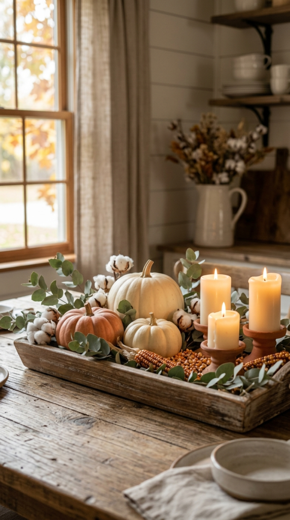 Styling Tips: Layer three sizes of pumpkins — one large, two medium, two small — for visual depth. Mix real and faux pumpkins to save money. Tuck in a few sprigs of dried eucalyptus or cotton stems around the base. Use a rustic rectangular tray with handles for that authentic farmhouse feel.