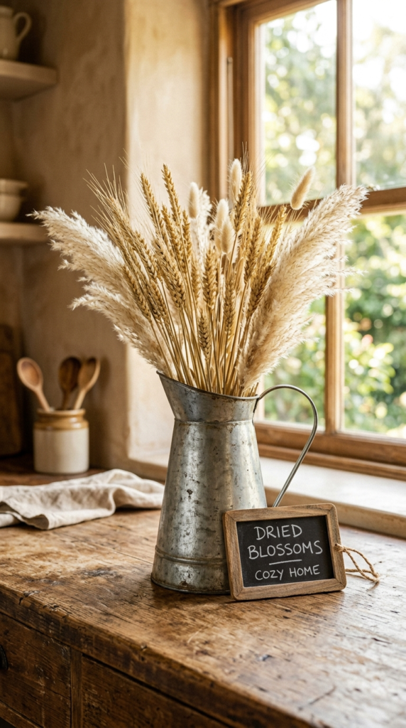 Nothing says farmhouse fall quite like a bundle of golden dried wheat or pampas grass casually arranged in a vintage galvanized metal pitcher sitting on your kitchen counter.