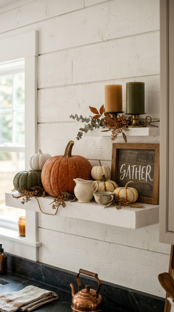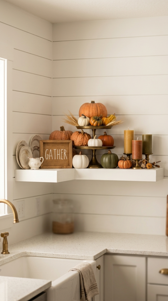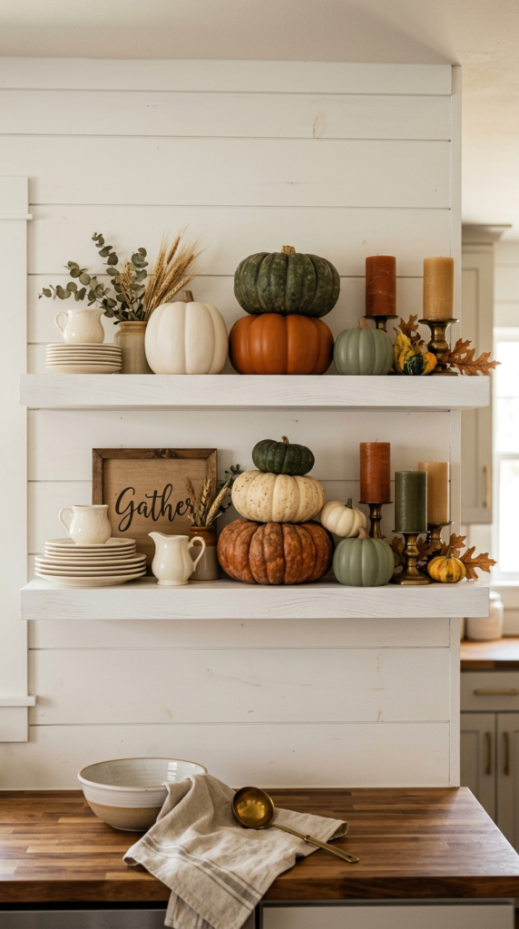 A white shiplap floating shelf dressed in layers of tiered pumpkins, vintage ironstone, and earthy candles creates that effortlessly curated farmhouse vibe everyone obsesses over on Pinterest.