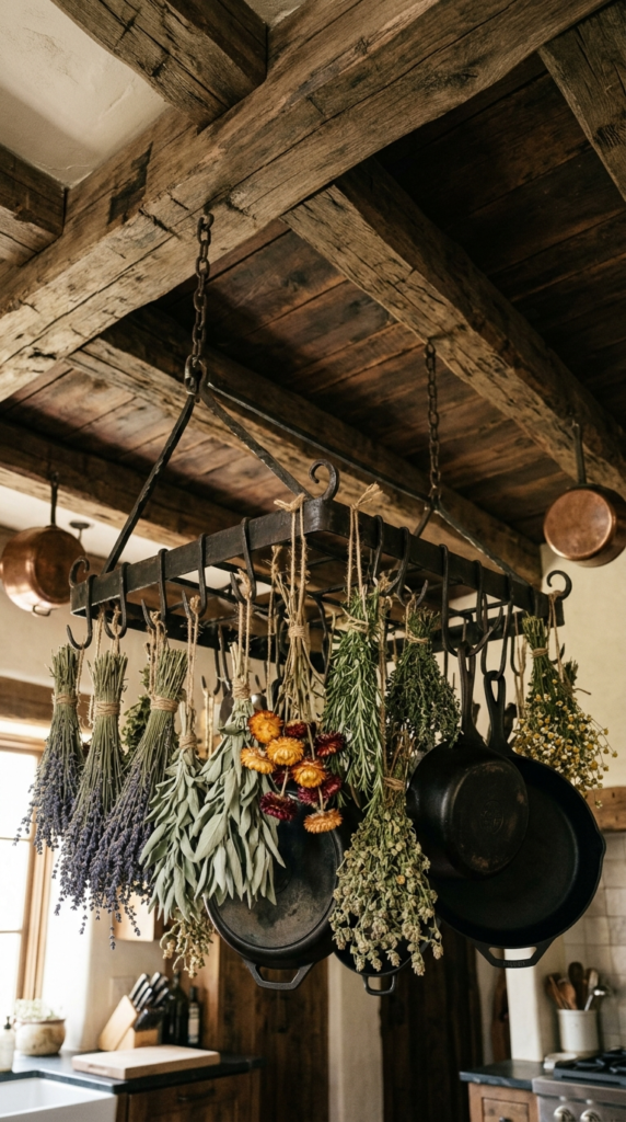Bundles of dried lavender, sage, rosemary, and thyme hung upside-down from a wrought iron pot rack above your kitchen island create an aromatic fall kitchen moment that’s wildly Pinterest-worthy.