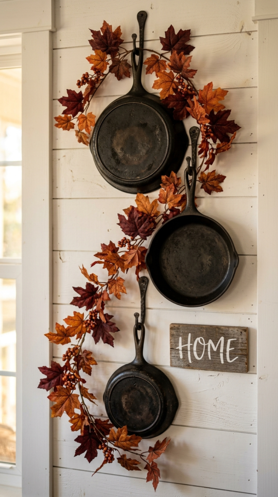 A collection of vintage cast iron skillets hung on a shiplap wall, accented with a garland of faux fall maple leaves draped casually along the hooks, turns kitchen tools into stunning seasonal wall art.