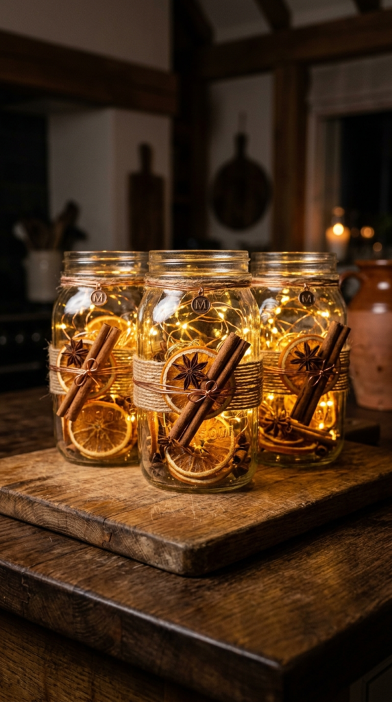 Styling Tips: Use wide-mouth quart jars for the best visual impact. Layer the bottom with dried orange rounds, then wrap fairy light strings inside loosely. Tuck two or three cinnamon sticks against the glass exterior and tie with copper wire. Group jars in an odd number — three works beautifully.