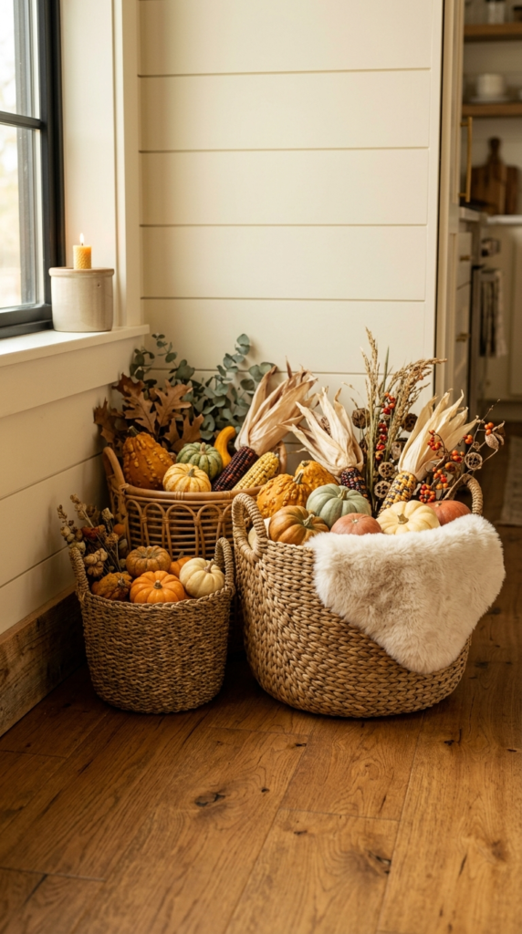 A curated collection of woven seagrass and rattan baskets in varying sizes displayed on open shelves or the floor, overflowing with miniature gourds, Indian corn, and dried botanicals, is pure farmhouse harvest magic.
