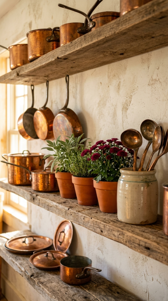 Gleaming copper pots and pans arranged on open shelving alongside a collection of potted autumn herbs like sage, thyme, and mini mums create a kitchen vignette that’s both beautiful and edible-garden inspired.